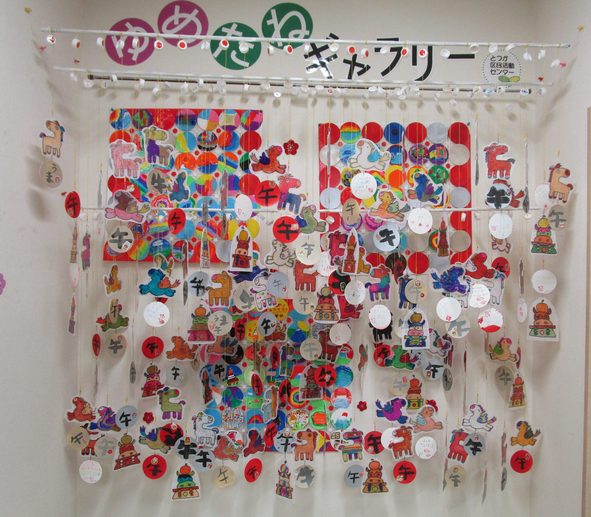 近隣の小学校 放課後キッズクラブの子どもたち104名が新年の抱負を胸に、色塗り、メッセージ描き、書と手間をかけた作品です