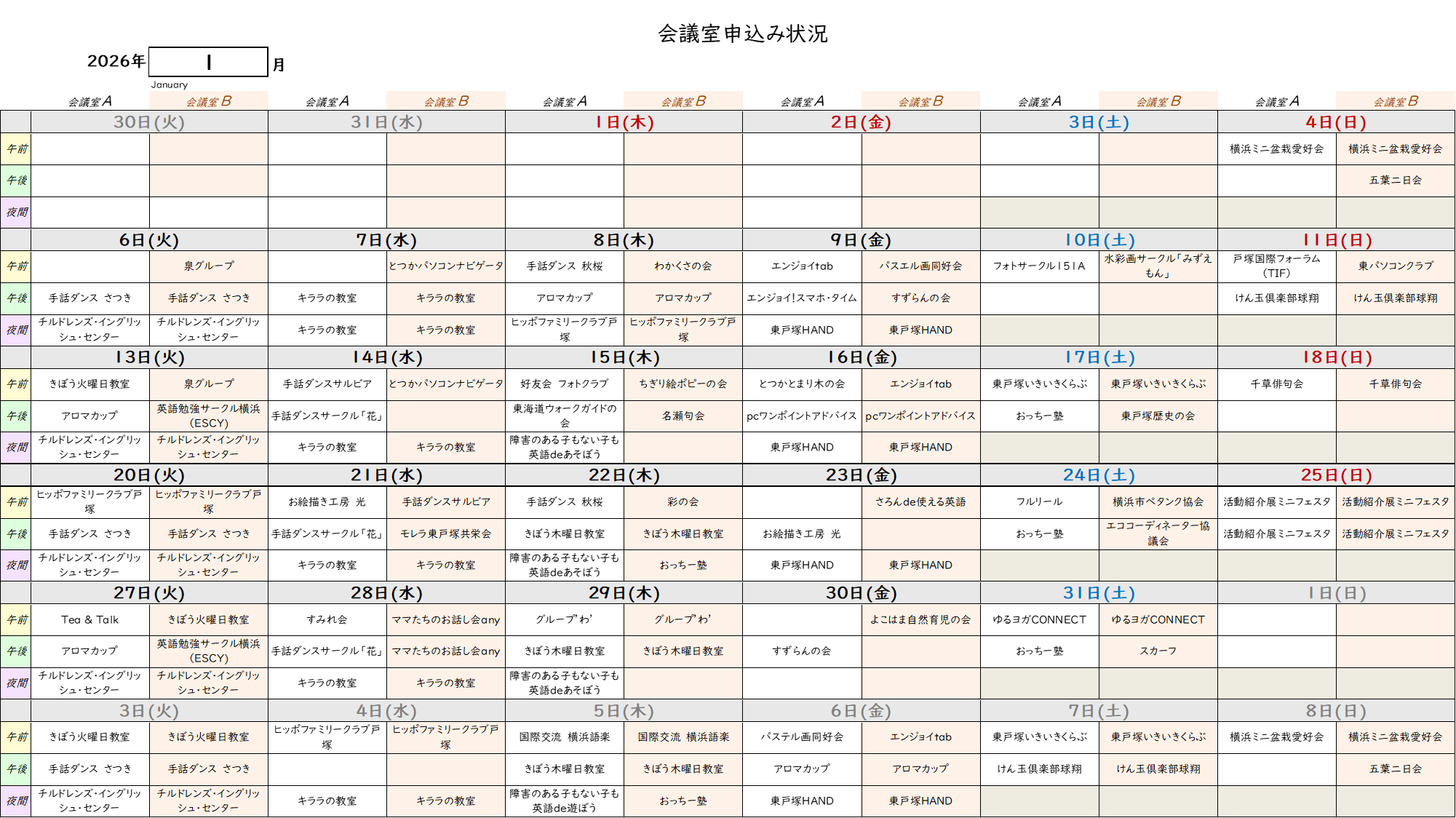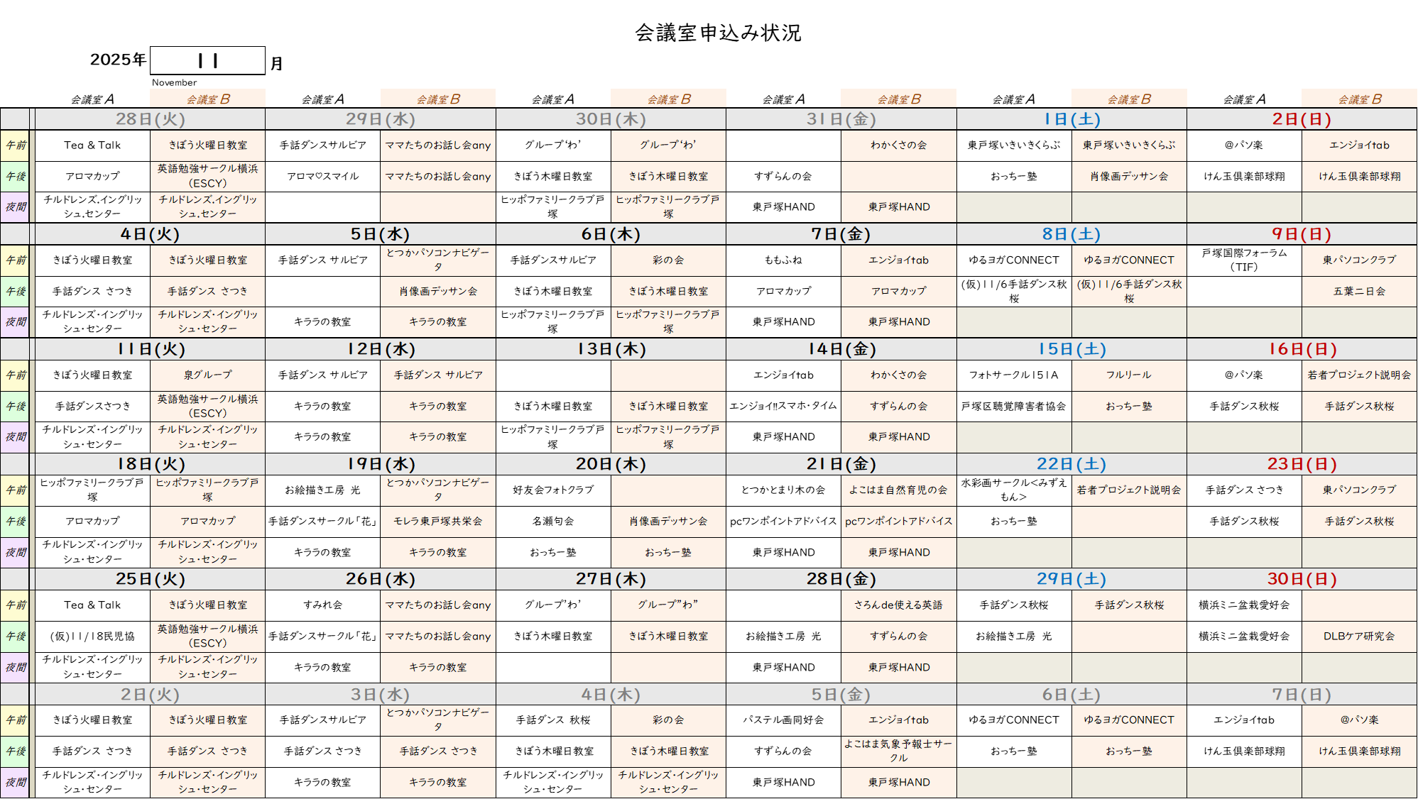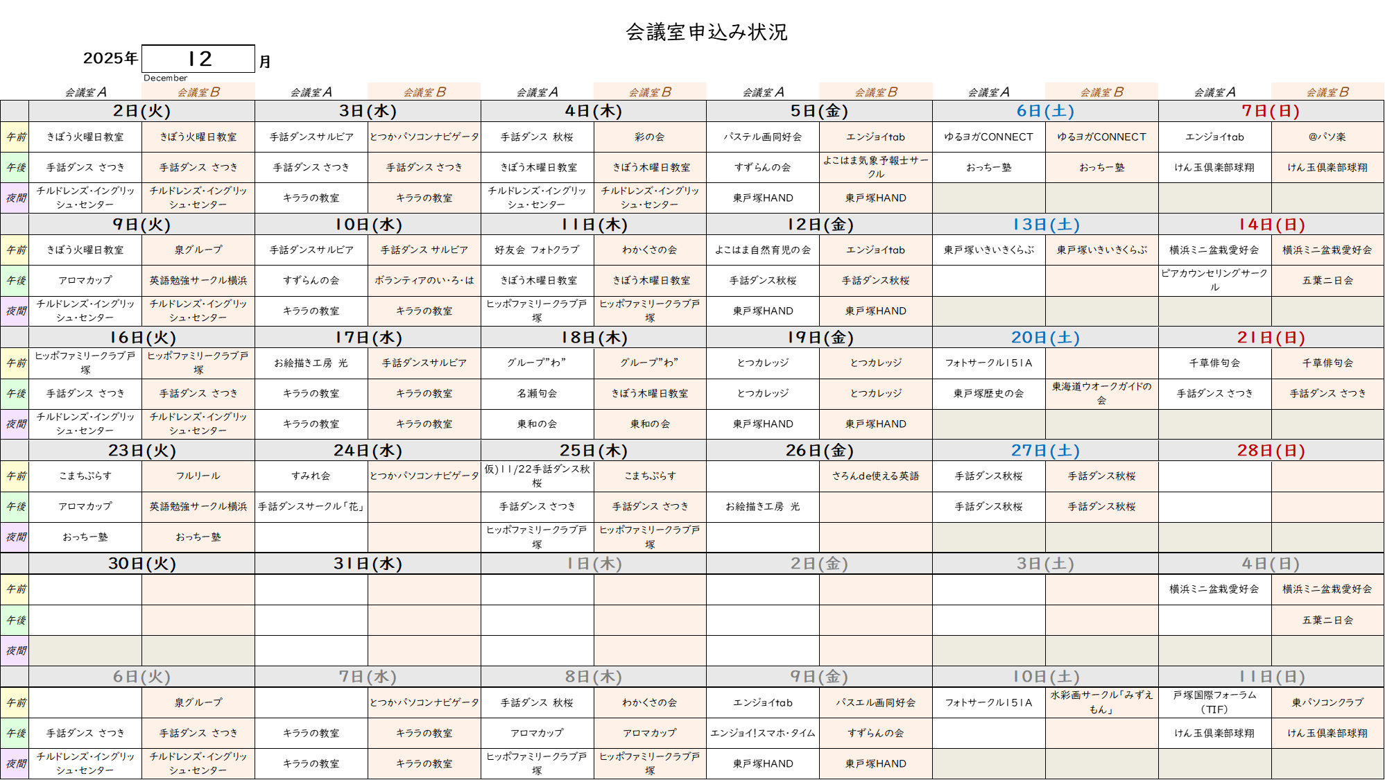 会議室申込み状況 【2025年11月~2026年2月】 2025/11/23 12:50更新