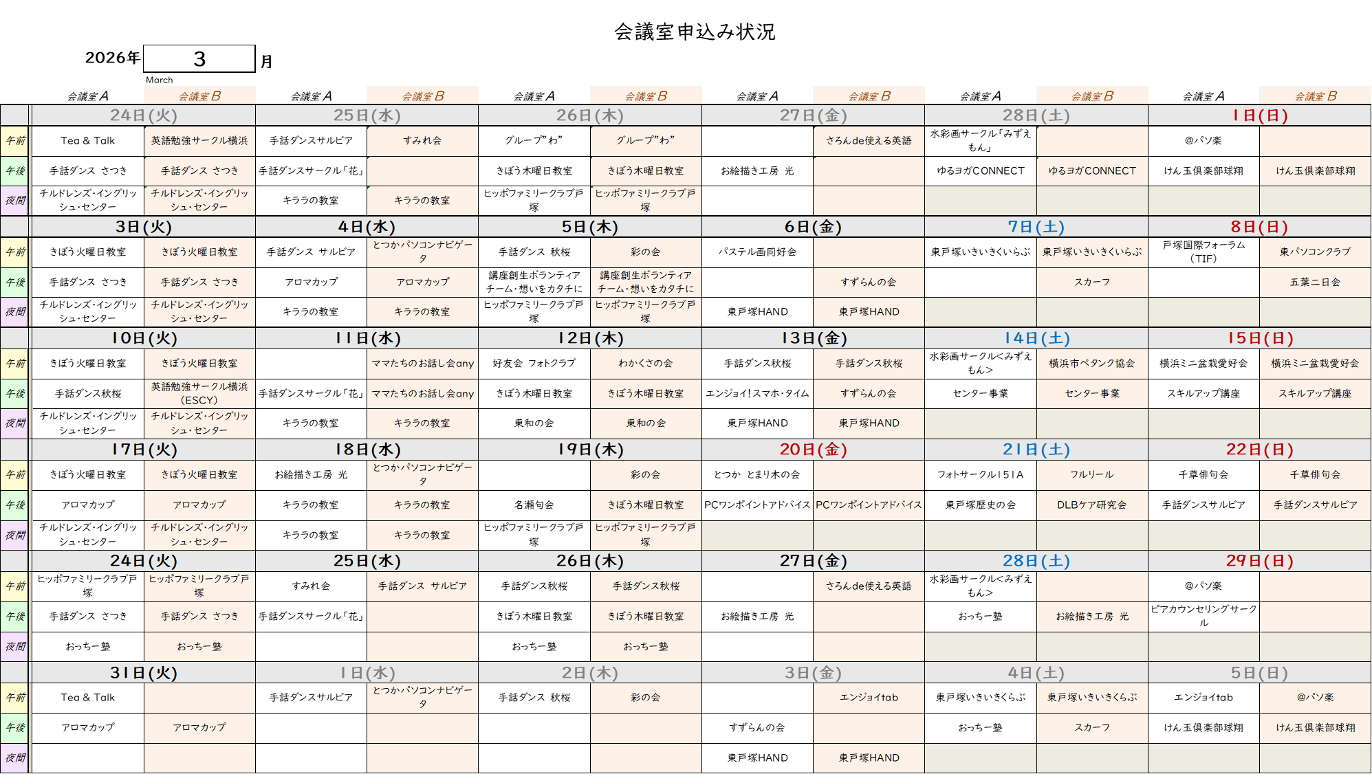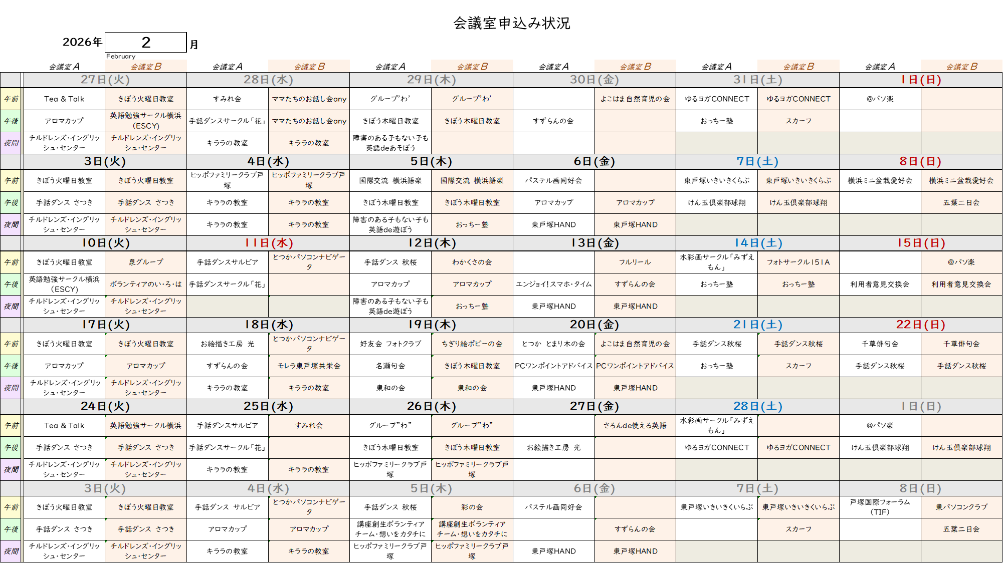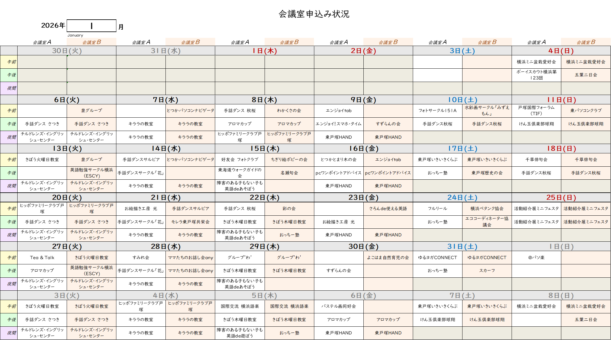 会議室申込み状況 【2026年1月~2026年4月】 2025/12/28 11:20 更新